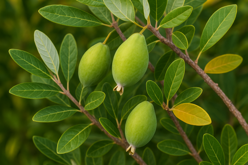 La feijoa è una pianta originaria del Sud America (Uruguay, Brasile e Argentina) che si è adattata molto bene anche al clima mediterraneo. Produce frutti verdi, ovali e profumati, dalla polpa cremosa e un sapore che ricorda ananas, fragola e menta. È una pianta rustica, ornamentale e produttiva, ideale per chi desidera coltivare qualcosa di originale nel proprio giardino o orto.